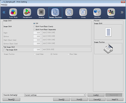 The setting items here are the same as those of "Image Position" screen of the PS Plug-in driver except the settings of the [Tab Image Shift]. For the description of the common setting items, refer to Image Position.