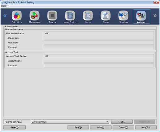 On the "Authentication" screen of the PS Plug-in driver, you need to enter the setting information of either the user authentication or the account track, or both of them. However, Job Centro automatically displays the setting information, so you do not have to enter the information. For the description of the setting items, refer to Authentication.