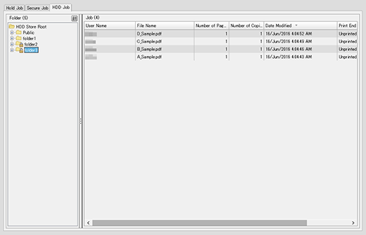 [Print End Date] | Displays the print end date of the HDD job. The jobs saved on the HDD are displayed as "Unprinted." The jobs which can be edited only with the touch panel of the main body are displayed blank. |