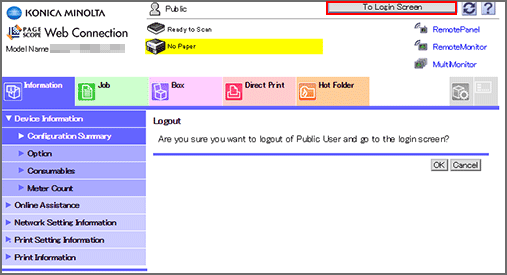 Message [Are you sure you want to logout of Public User and go to the login screen?] is displayed. Click [OK].