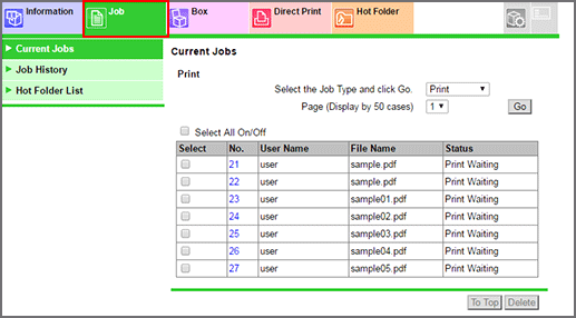 [Current Jobs] | Enables you to check the currently executed job or queued jobs. |