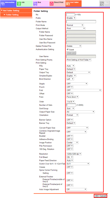 [Authentication Setting] | To allow anyone to access the hot folder, check the [Guest] checkbox. |
