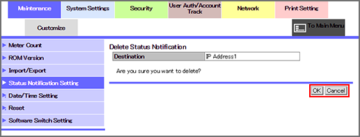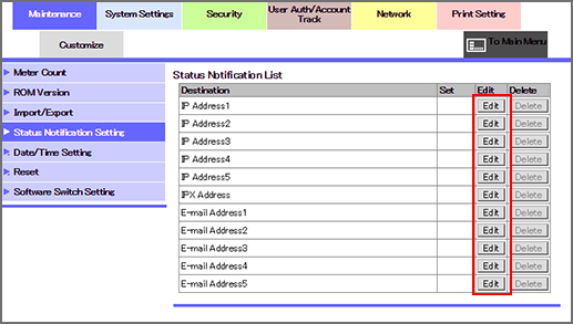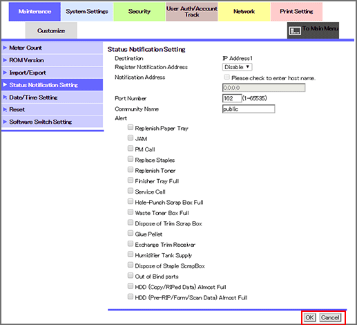 Click [Status Notification Setting] on the menu of [Maintenance] tab to display this screen.
