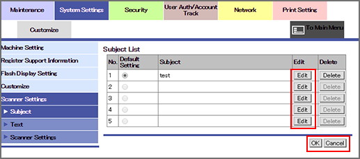 This screen allows you to edit or delete the subject of e-mail. When [Default Address] is set to [E-mail] in [User Settings] - [Scan Setting] on the Utility menu, the subject that is selected during scanning is specified.