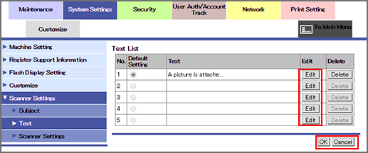 This screen allows you to edit or delete the body text of e-mail. When [Default Address] is set to [E-mail] in [User Settings] - [Scan Setting] on the Utility menu, the text that is selected during scanning is specified.