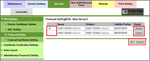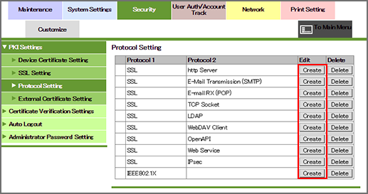 Click [PKI Settings] - [Protocol Setting] on the menu of [Security] tab to display this screen. This screen is not displayed without any SSL certificate installed.