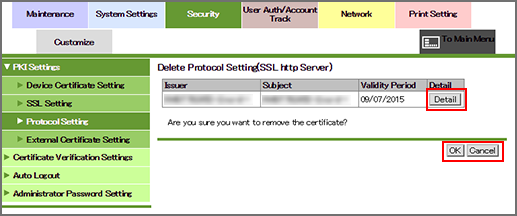 Click [Detail] to view the details of the certificate. The device certificate list is displayed. Click [Back] to return to the [Protocol Setting] screen.