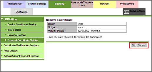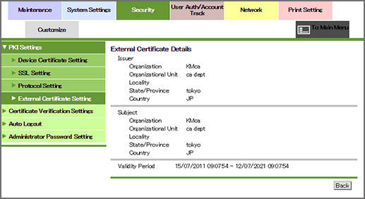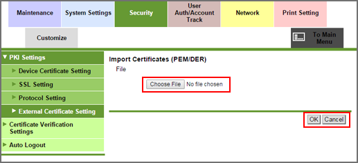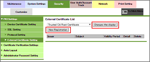 Click [PKI Settings] - [External Certificate Setting] on the menu of [Security] tab to display this screen.