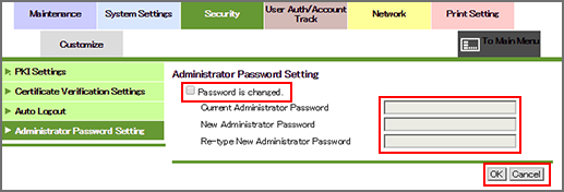 Select the [Password is changed.] checkbox, and enter the current administrator password.