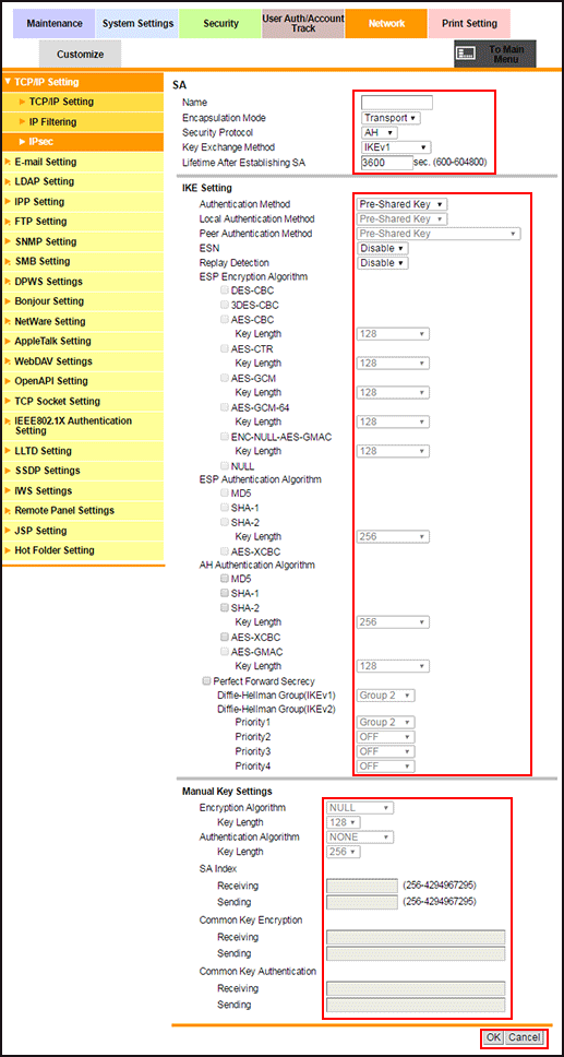 [Key Exchange Method]: Select the method that safely generates the common key used for encrypted communication. When using a device that is not compatible with the automatic key exchange by IKE, select [Manual Key]; you can manually specify detailed parameters.