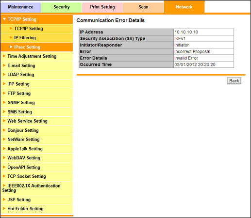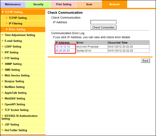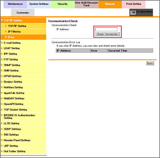 The check result is displayed. If a communication error has occurred, message [Connection failed.] is displayed. If a communication error log exists, [IP Address], [Error], and [Occurred Time] are displayed.