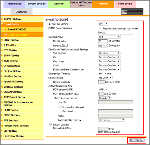 This screen allows you to make the settings on E-mail transmission by SMTP. The settings described in this section are always required if you want to use Scan to E-mail.