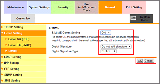 To use S/MIME, select [ON] from the [S/MIME Comm.Setting] drop-down list.