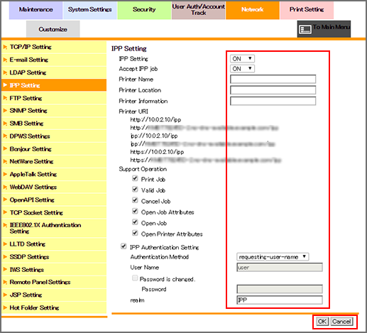 Click [IPP Setting] on the menu of [Network] tab to display this screen.