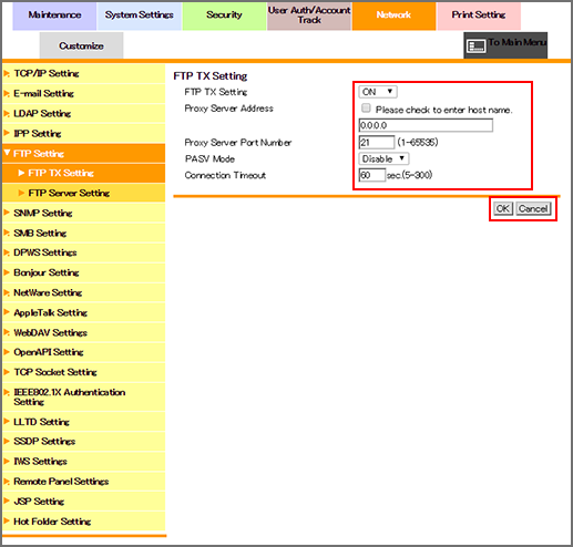 Click [FTP Setting] - [FTP TX Setting] on the menu of [Network] tab to display this screen.