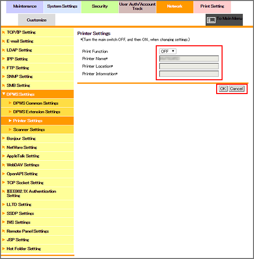 Click [DPWS Settings] - [Printer Settings] on the menu of [Network] tab to display this screen.