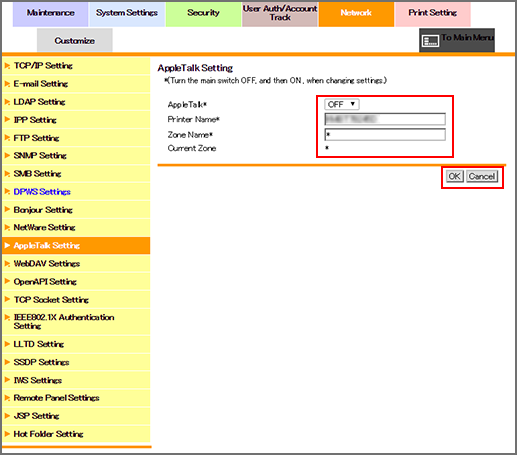 Select either [ON] or [OFF] from the [AppleTalk Setting] drop-down list.