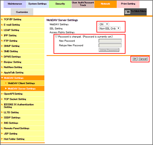 Select either [ON] or [OFF] from the [WebDAV Settings] drop-down list.