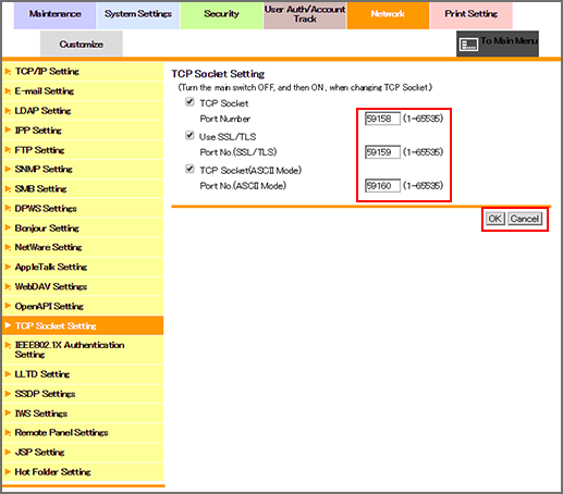 Click [TCP Socket Setting] on the menu of [Network] tab to display this screen.