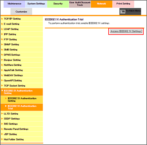 If [OFF] is selected for the [IEEE802.1X Authentication Setting], the IEEE802.1X Authentication Trial cannot be performed. Click [IEEE802.1X Authentication Setting] to switch the setting to [ON].