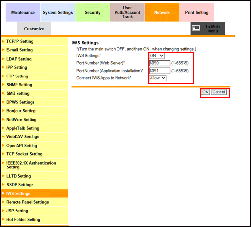 This screen allows you to select whether to use Internal Web Server (IWS). Using IWS function enables to transfer a print data conversion application to the machine and use the print data conversion function and other functions.
