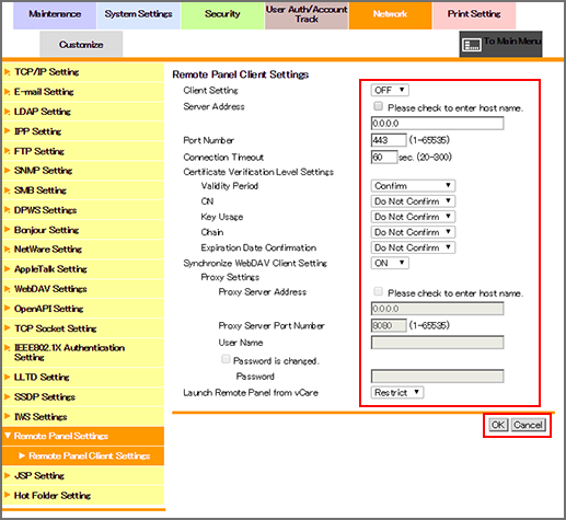 Click [Remote Panel Settings] - [Remote Panel Client Settings] on the menu of [Network] tab to display this screen.