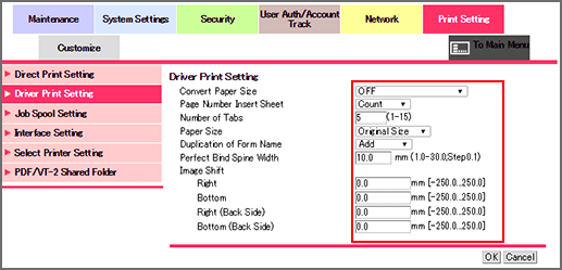 Select [OFF], [8.5 x 11/11 x 17 to A4/A3], or [A4/A3 to 8.5 x 11/11 x 17] from the drop-down list of [Convert Paper Size].