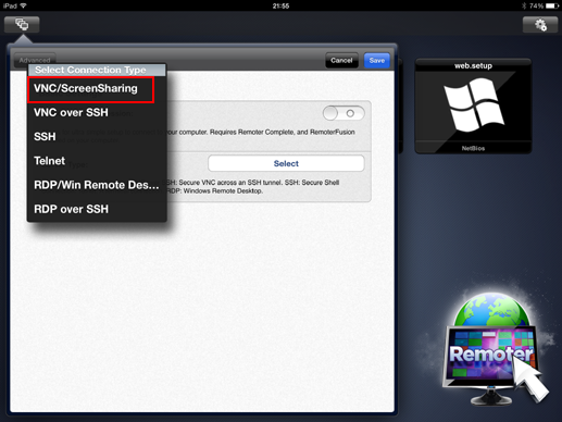 4. Tap [Select] of "Server Type," and then select [VNC/ScreenSharing].