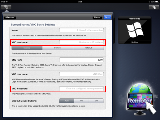 The following procedure is an example showing how to set up the VNC Viewer for iPad "Remoter VNC."