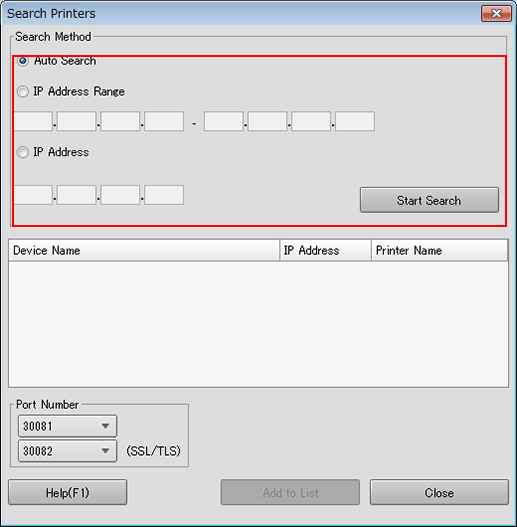 To search the machines by entering the IP address, click [IP Address Range Search] or [IP Address Designation Search].
