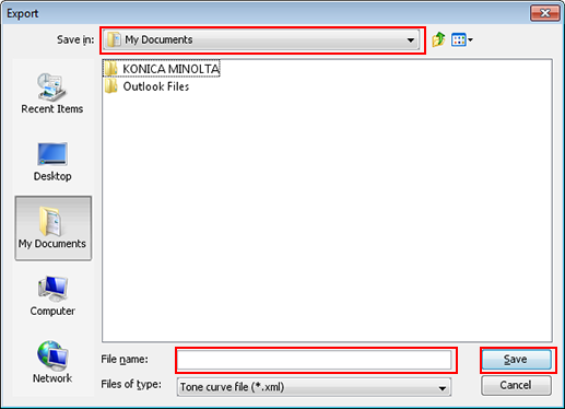 You can export a tone curve of the image controller to [Local], [My Documents], or [Network] as a profile (Extension: .xml).