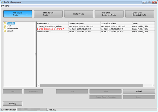 When you display the [Profile Management] screen for the first time after starting Color Centro, the list is displayed in the ascending order of [Profile Name] (in the case of [Controller]), or [File Name] (in the case of [Local], [My Documents] or [Network]).