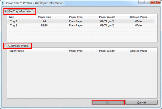On [Get paper Information] screen, select [Get Tray Information] or [Get Paper Profile] and select the tray information or paper profile which you use then click [OK].