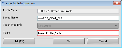But, you cannot change the table name of the RGB-CMYK device link profile which was registered at factory shipping.