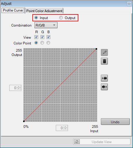 1. In the [Profile Curve] tab on the [Adjust] screen, select [Input] or [Output].