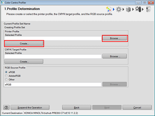 1. Specify the name of printer profile which is used by Profile Set. When you use the existed printer profile, click [Browse]. To create a new printer profile, click [Create].