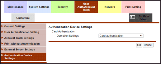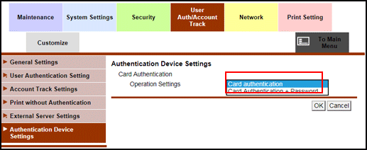 In [Authentication Device Settings] - [Operation Settings], select [Card authentication] or [Card Authentication + Password].
