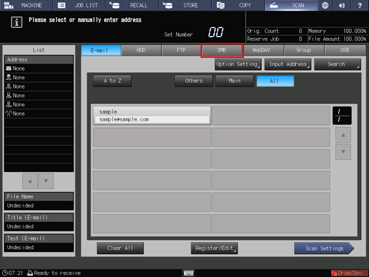 As default, the E-mail address list is displayed. For details about the default destination tab on the [SCAN] screen, refer to Scan Setting: Setting the Default Values for Scan Functions.