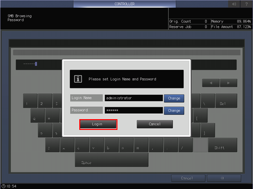 The authentication screen is displayed. Press [Change] for both the login name and password, and then input the authentication information.