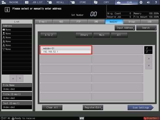 • To manually enter a destination, refer to "When a WebDAV Server is Not Registered."