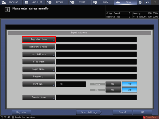 • The settings on the Scan Settings screen and the address selected on the [SCAN] screen may remain until the machine is restarted. It is recommended to release the setting and address once the operation is completed.