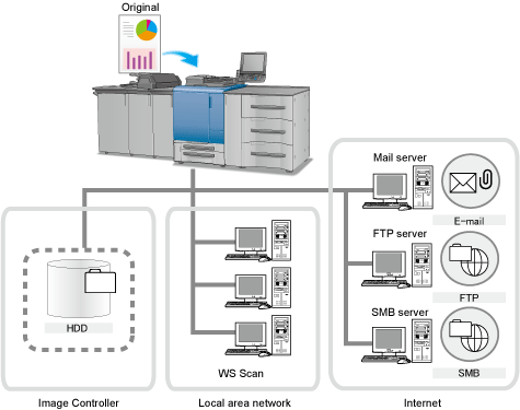You can send the scan data as an E-mail attachment file, upload to an FTP server or SMB server, or save to an HDD.
