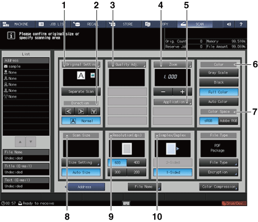 1 | [Original Setting] | You can set separate scan, bind direction of two-sided original (whether the top and bottom of both sides are the same, or one side is flipped vertically), original orientation, and original type. | ||