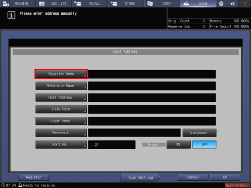 The settings on the Scan Settings screen and the address selected on the [SCAN] screen may remain until the machine is restarted. It is recommended to release the setting and address once the operation is completed.