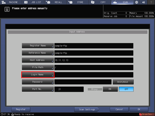 Pressing [Anonymous] inputs "anonymous" in the [Login Name] field. This key is available when you use the Anonymous FTP. (where files are shared between unspecified number of users).