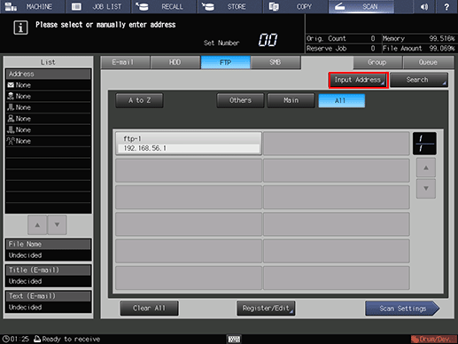 As default, the E-mail address list is displayed. For details about the default destination tab on the [SCAN] screen, refer to Scan Setting: Setting the Default Values for Scan Functions.