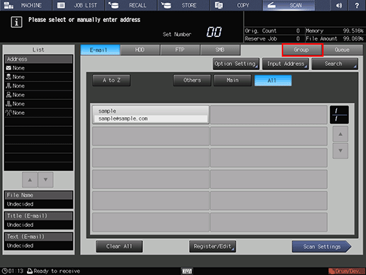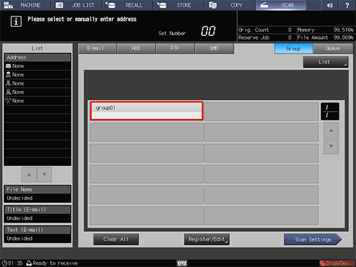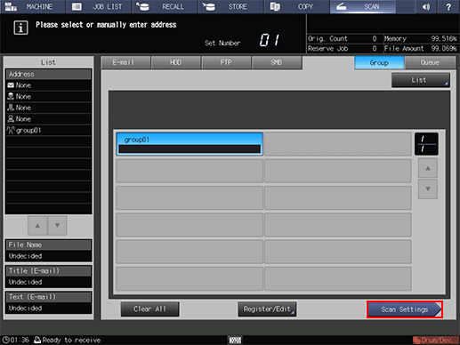 As default, the E-mail address list is displayed. For details about the default destination tab on the [SCAN] screen, refer to Scan Setting: Setting the Default Values for Scan Functions.