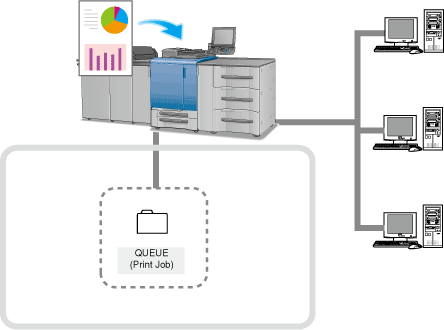 You can convert the data scanned from the ADF or the original glass (scan data) to a PDF file to save it as a print job (print queue).