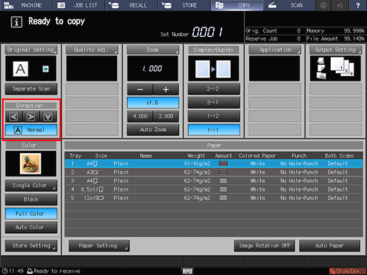 This setting is also available from the [Direction] area of the [Original Setting] screen. To display the [Original Setting] screen, press [Original Setting] on the [COPY] screen.