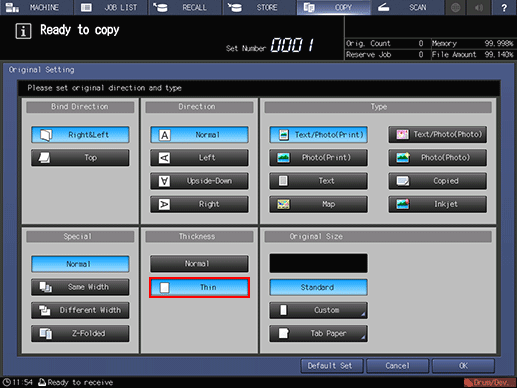 If you select [Thin] to copy the original of which the weight is 50 g/m2 to 210 g/m2 / 14 lb Bond to 55 lb Bond, it may cause copy productivity to be reduced or a copy image to become skewed. Select the appropriate option to suit the original.